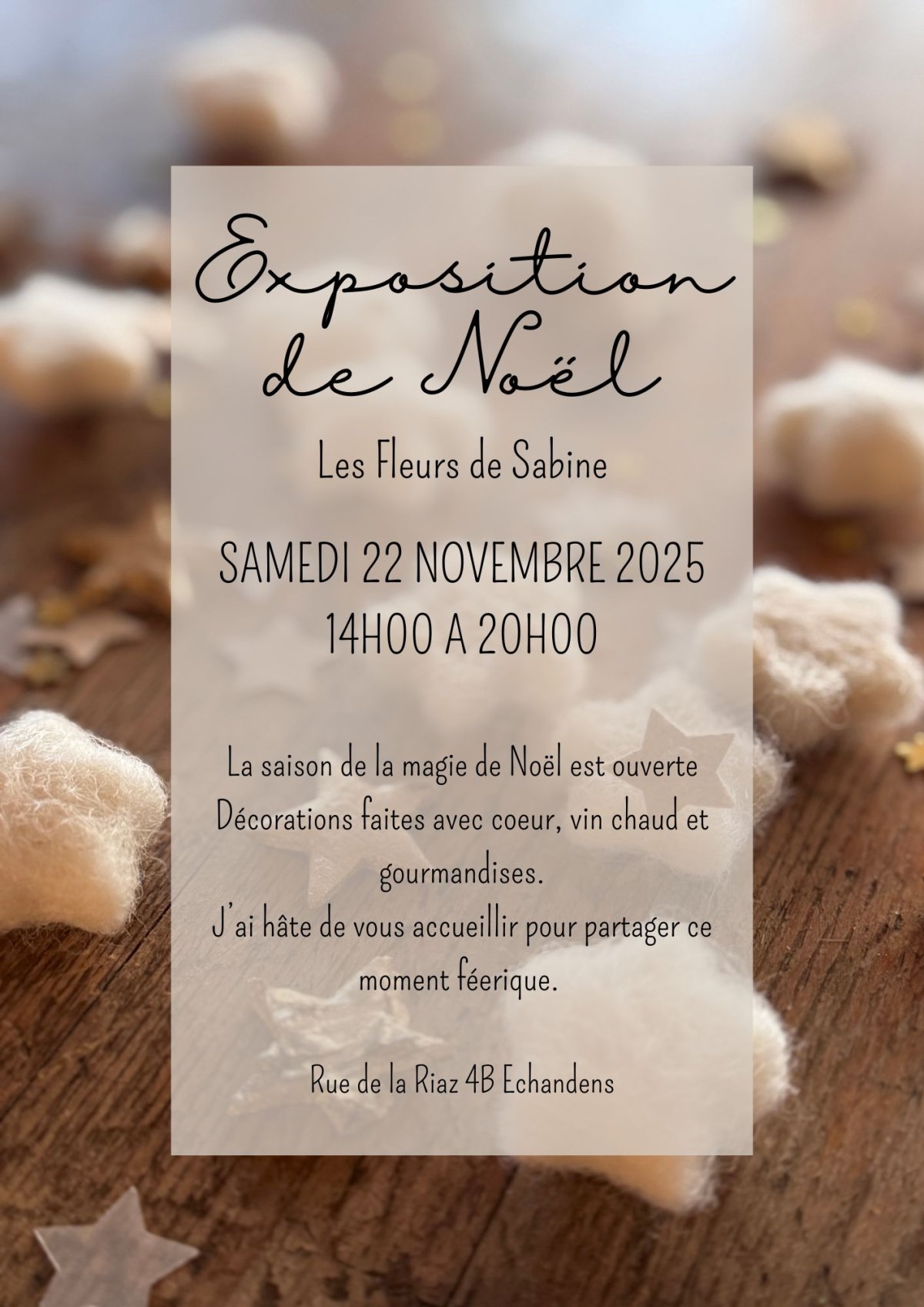 Rejoignez-nous pour célébrer la magie de Noël, décorations faites avec coeur, vin chaud et gourmandises.